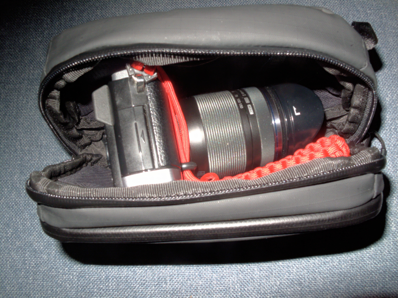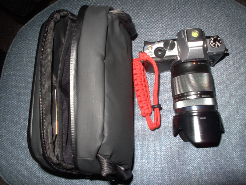 Here’s an alternate loadout, Olympus E-M5 and M.Zuiko 14-150mm, a snug fit width-wise but doable. πŸ™‚