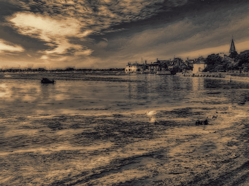 A toned monochrome landscape work of the pretty village of Bosham, West Sussex.