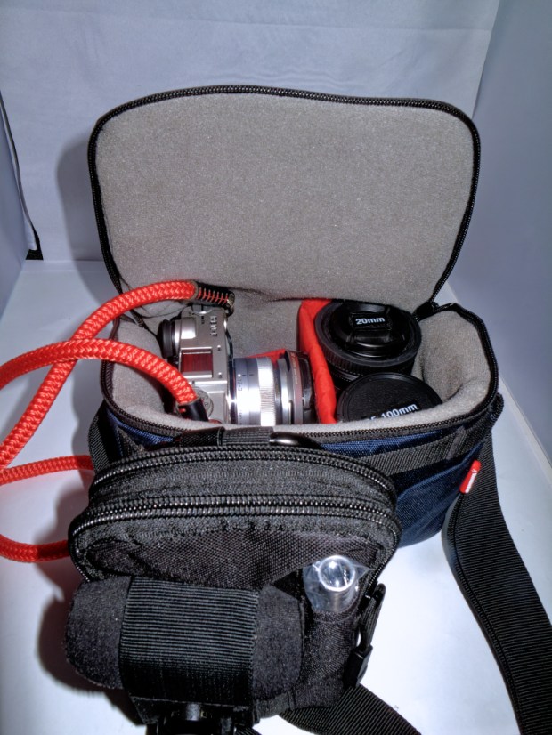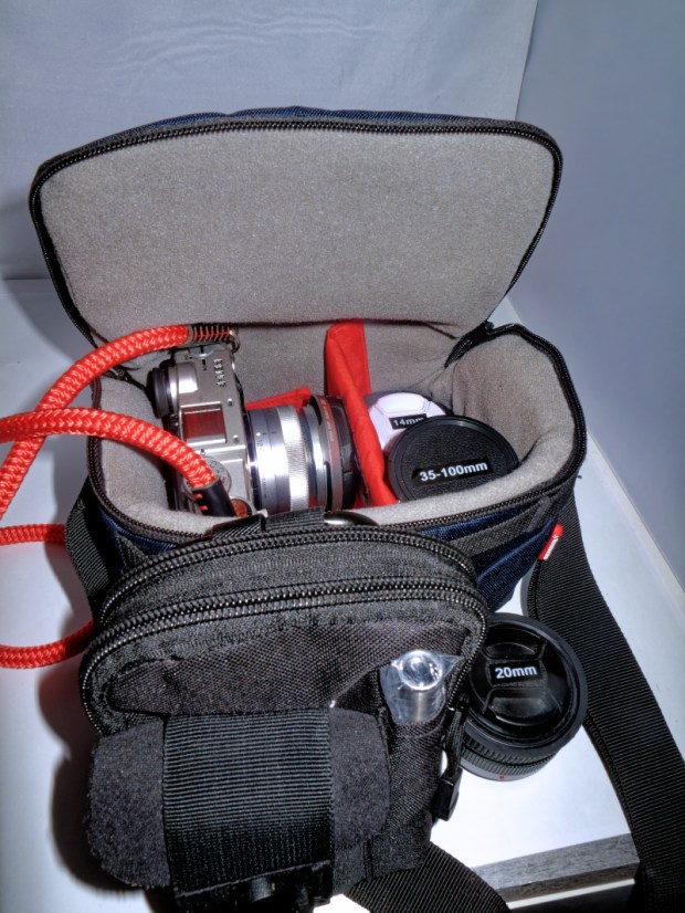 For years now I’ve steadily been pursuing my quest for my own Holy Grail, that is to get my gear down to the lightest and most compact setup that I can achieve. In addition to my small camera bag and small sized camera gear such as my PEN-F camera and a few lenses, my Lumix 12-32mm, 35-100mm zooms and two faster Lumix prime lenses, my 14mm f/2.5 and 20m f/1.7 there are other items that I like to carry that can’t all be accommodated in such as small bag such as one of my small dual-port USB power banks, a couple of USB charge cables, one of my small USB camera battery chargers, my USB data logger and a small USB rechargeable pen torch (surprising how often this comes in useful) πŸ™‚ and other somewhat bulkier items that I feel “obliged” to carry such as my mobile phone. Normally I stuff these into various jacket pockets but this isn’t ideal for a hot day, like yesterday, when I want to go out dressed for the weather wearing a T.Shirt and a pair of shorts and not encumbered by extra clothing worn solely for the purpose of accommodating these items. I don’t want to be a slave to my camera gear, I want it to serve me and not vice-versa!.