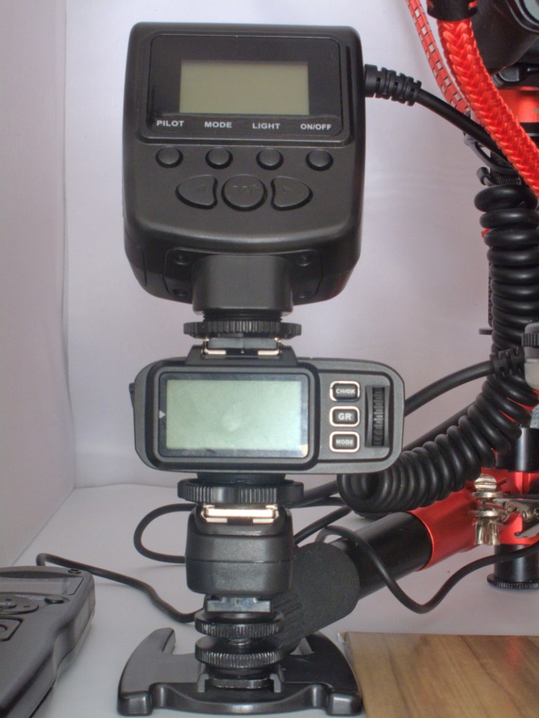 Closeup of the Godox X1-T flash trigger mounted on top the FC-03 flash cable with the ring flash controller mounted on top of the X1-T. The X1-T, triggered by the camera, fires my Godox TT-350 flash and acts as a manual pass-through to the ring flash controller. The ring flash unit has two modes flash and light with a of 7 levels of brightness adjustment as well as one or two banks of LEDs. Using this I can either choose to use the ring flash in LED mode or flash mode and also trigger the TT-350 flash.