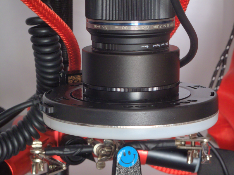The business end of the 30mm lens with the ring flash attached. I’ve fitted a lens hood and circular polarising filter and then the ring flash. The polarising filter is only of use when the ring flash/light is removed and mounted separately or I’m using another lighting arrangement as it has no effect because the light direction is perpendicular to the lens. I’m going to experiment with using some linear polarising sheet which I can position in front of the light and I can use it in addition to polarise the light source.
