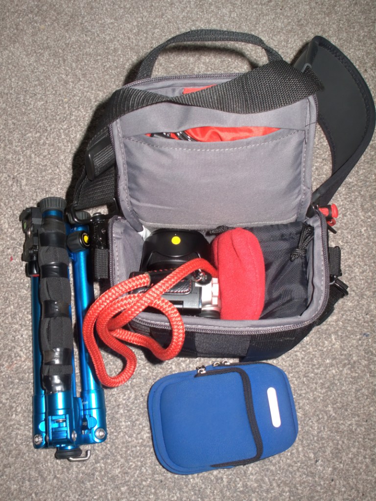 PS. I forgot that I had this 5 Litre capacity dry bag which easily accommodates the tripod and my intervalometer and maybe a few other small things like sandwiches? and is of course water proof and it has a bigger and wider strap. πŸ™‚ It could also be filled with something heavy like stones from the beach and hung under the tripod to add extra stability if required. Making sure of course that one has removed one’s sandwiches first. πŸ™‚