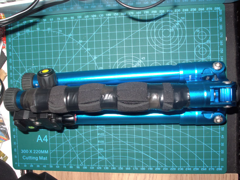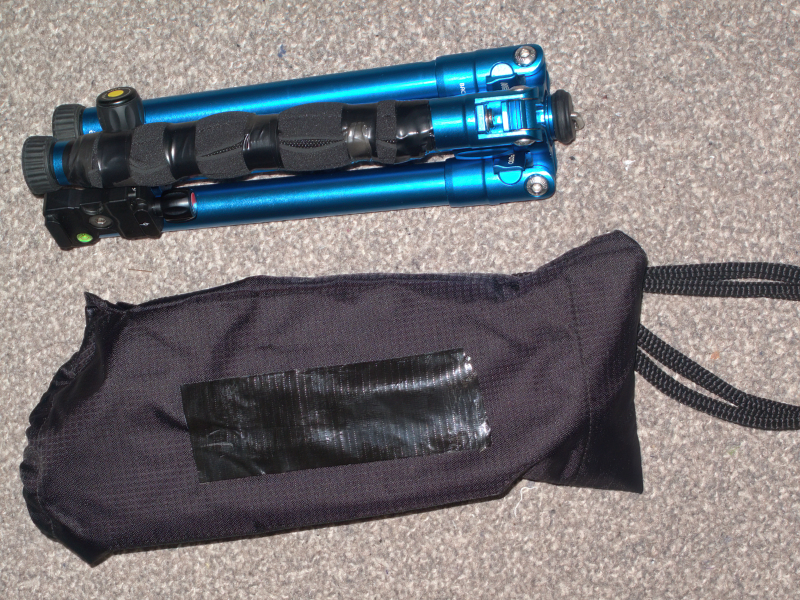 As a user of Micro Four Thirds gear it works well as my cameras and lenses are all compact and lightweight. It’s not the tallest tripod in the world and not well suited for anyone who is tall and definitely not suited for heavy cameras and lenses but, for my needs at approx. 5 ft 8 inches tall with lightweight cameras and lenses it gets the job done. Typically I’ve done a few simple modifications to suit my personal preferences. It comes with a nice small carrying bag with decent sized cord strap which, unlike some bags with a thin cord, doesn’t cut into one’s neck and shoulder too much. I’ve covered over the large ME FOTO logo with some black gaffer tape as I’ve done with the logos on all my bags. I don’t wish to be an unpaid walking advert for anyone’s gear or draw unnecessary attention to the contents. The metal tripod legs are pretty slippery especially on a cold day if one’s wearing gloves so I’ve taped some neoprene round one leg to make it easier to grip when carrying. Lastly I’ve added red and yellow sticky dot labels to aid in quickly differentiating between the quick release plate and ball head locking knobs.