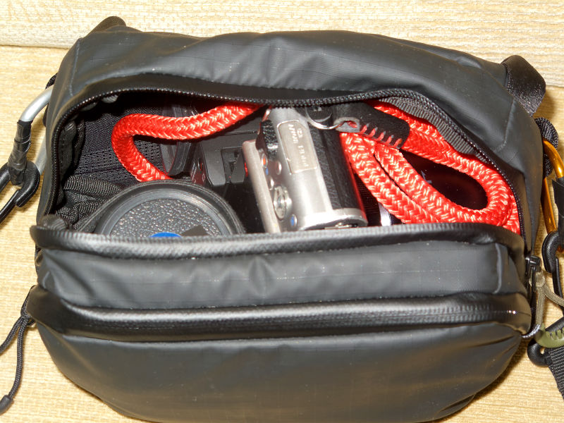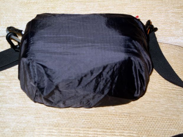 I have to say that I’m impressed with the water-resistant properties of the Tech Pouch which got very wet in a recent outing and everything inside stayed dry but the addition of the rain cover gives me peace of mind to further protect against heavy precipitation. The rain cover has two slits, one on each side through which one threads a shoulder strap. I decided to remove the Wandrd strap and use the one belonging to the Manfrotto bag. Although the Wandrd strap does work, I didn’t much like the quick-release magnetic catch which can and has come apart on occasions and securing it with a couple of cable ties as I originally did prevents attachment of the rain cover. I fitted two carabiners as a temporary measure whilst I wait for some attachable 30mm D-rings to arrive and this arrangement seems a lot more secure and the strap is wider and spreads the weight better.