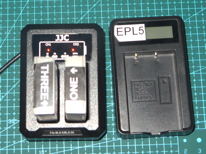 I thought I’d get one of these, this time for my BLS-5/BLS-50 batteries as used in my Olympus E-PL5 and E-PL8 cameras and some later models of OM-D series cameras. I tested it quickly and it charged two pretty flat batteries in approximately 2.5 hours. I like the built in hard-wired USB cable terminating in a USB A male connector which stores in the base of the charger when not in use although be aware that it is very short, they do supply a short (40cm) USB extension cable with it but it’s a tight fit and doesn’t really add much to the overall cable length so I used one of my longer USB extension cables with it for this test. Not an issue if the charger is sitting on a desk next to or close by the USB power source eg. my Anker 5-port USB charger or one of my USB power banks, laptop etc. but something perhaps to consider if using another power source such as a USB port in a vehicle or a USB charger plugged into a raised wall socket. I like the red charging indicator LEDs, one for each battery slot, which blink once for charge up to 25%, twice for up to 50%, three times for up to 75% and light solidly when fully charged. They do them for all sorts of camera battery types so, I’m guessing that they all behave roughly the same. Here it is next to one of my older USB single battery chargers for comparison, As you can see it’s very slightly taller but overall pretty much the same size as the single battery charger.