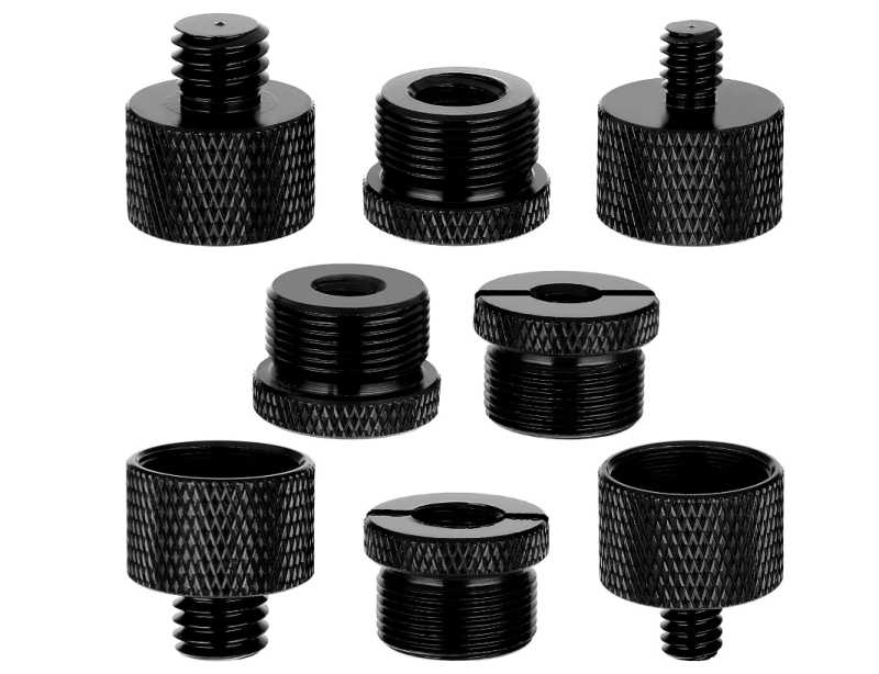 Search Amazon for – Prasacco 8 Pieces Mic Stand Adapter, 5/8 Female to 3/8 Male 3/8 Female to 5/8 Male 5/8 Female to 1/4 Male 1/4 Female to 5/8 Male Screw Thread Adapter for Microphone Stand Mount to Camera Tripod