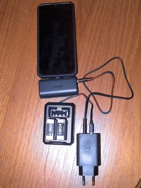 Update: I’ve now had a chance to try out passthrough charging the Anker Nano power bank (USB Type-C) and my phone and also simultaneously charging two camera batteries using my JJC USB dual camera battery charger (USB Type-A) from my Motorola 50w USB wall charger. All seem to work well, so these are going in my camera bag hand luggage. πŸ™‚ These are the things that I most frequently need to charge and serving as a backup to the charging gear in the tech bag in my hold luggage should my case go missing.