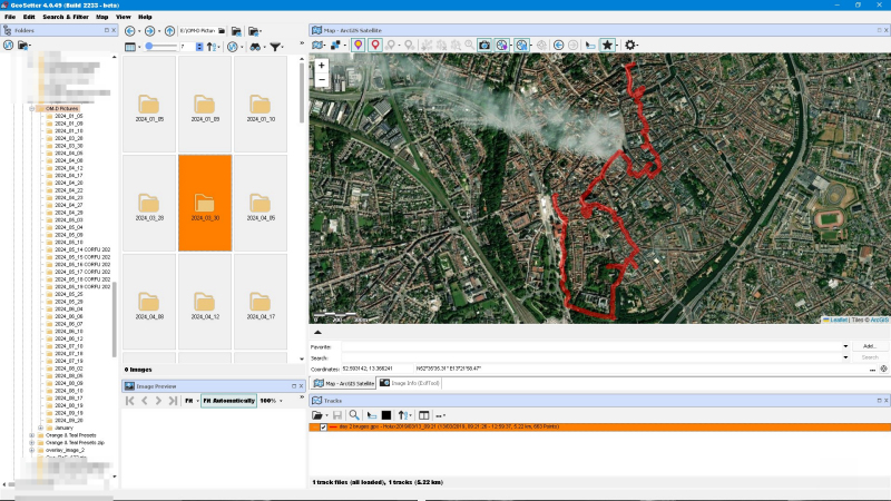 On the left one can see the list of folders containing one’s shots, select the appropriate folder and then the images can be Geotagged to the location information contained in the selected track file and displayed on the map.