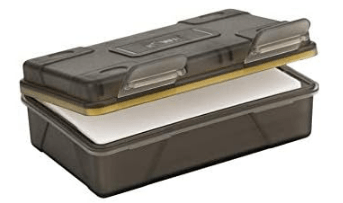 My chosen memory card and battery case. This one holds two batteries and has compartments for 5 SDHC cards as well as several micro SD cards and 2 Compact Flash cards of which I have no need so I keep a couple of lens wipe sachets in these yellow-coloured hinged compartments instead. Both battery types (BLN-1 and BLS-5/50) as fit my various Olympus OM-D and PEN series cameras fit in comfortably. It’s not overly heavy, it’s water-resistant, well constructed and gives a good degree of protection to the contents which is just about all I can ask of it. A slight cautionary note, I’ve added some prominent “This way up” labelling to the outside of the hinged lid as if, in an absent-minded moment, one inadvertently opens it upside down then everything is going to fall out!, I speak from experience . πŸ™‚ What would be nice is some form of latching bar mechanism over the batteries and cards which would prevent this from happening.