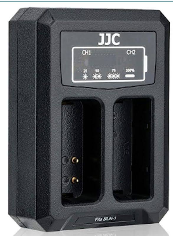 JJC USB dual camera battery charger, I have two of these to suit different types of camera batteries. It has a short 15cm hard-wired built in USB Type A cable which folds away neatly and stores on the back, it’s small, light and works well. It also comes with a short 40cm USB extension cable which could be useful.